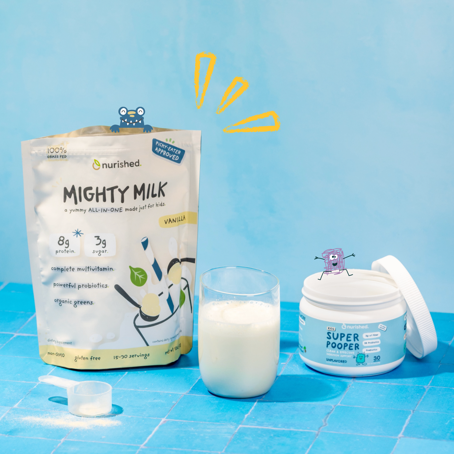 A bundle of two amazing, complementary, products offers a powerful boost to your child's daily health routine. Protein, vitamins, and organic greens in every glass of your favorite Mighty Milk flavor! Clean & effective digestion support in every unflavored Scoop of Super Pooper - 3g of fiber, prebiotics (chicory root), and 3B probiotics.